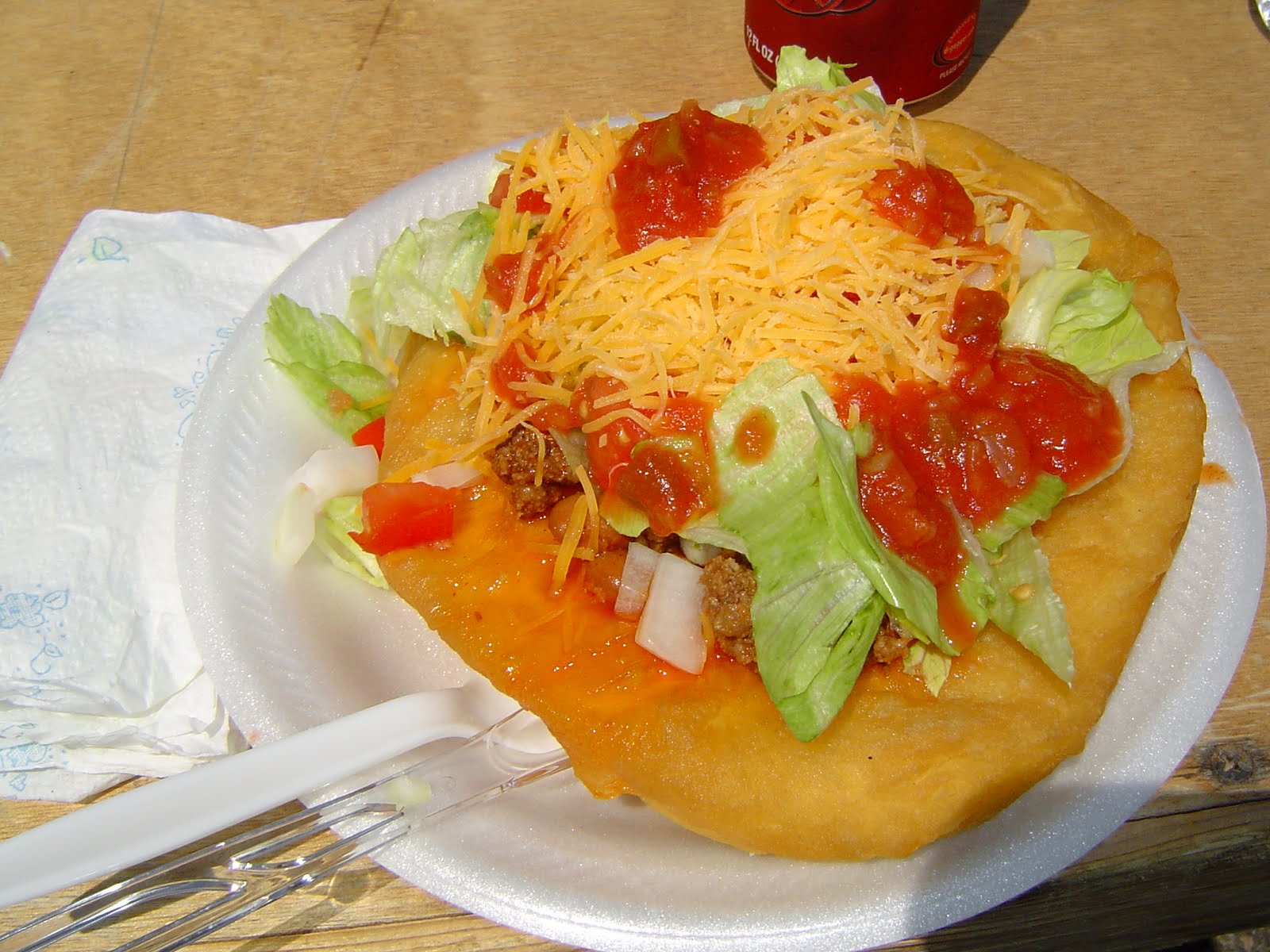カーニーの二日目は、楽しみにしていたPow Wowが開催される「Great Platte River Road Archway」に行きました!Pow Wow(パウワウ)とは、ネイティブアメリカンのダンスのお祭りで、夏になると、アメリカ各地で行なわれるようです。今回6月に、カンザスシティーからそれ程離れていない所を旅行しようということになり、リサーチをしている際に、ネブラスカ州カーニーでパウワウが開催されることを知り、カーニーに行ったという次第です。朝、ホテルのセルフサービスコーナーで、ワッフルを作り、オレンジジュースと一緒に食べ、いざ出発!最初、ホテル近くのお土産屋さんに行きました。ネブラスカ州のTシャツや、ネイティブアメリカンの小物などが売っていて、夫はそこで、小さな矢が付いたネックレスを購入しました。お店の人に会場までの行き方を聞くと、近くのアリーナに駐車し、そこからシャトルバスに乗らなければならないとのこと。幸いそのアリーナは店のすぐ近くで、簡単に見つけることができました。 シャトルバスに乗ると、既に10名ほどの観光客が乗っていました。一気に旅行気分が倍増し、ワクワクしてきます。アリーナから会場までは結構な距離。何でも、去年初めてパウワウを開催した時は、駐車場がいっぱいになり、周りに迷惑をかけたので、今年はアリーナからシャトルバスを手配したようです。「Great Platte River Road Archway」に着くと、建物の前に、既にお土産やさんや、ネーティブアメリカンの食事を販売するテントが出ていたので、早速、「インディアンタコス」に挑戦しました。